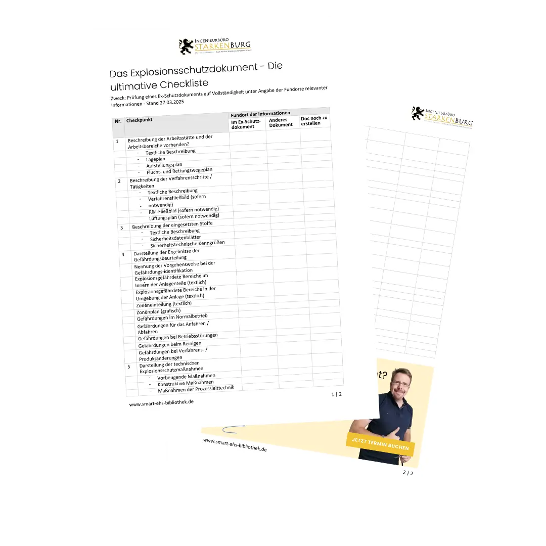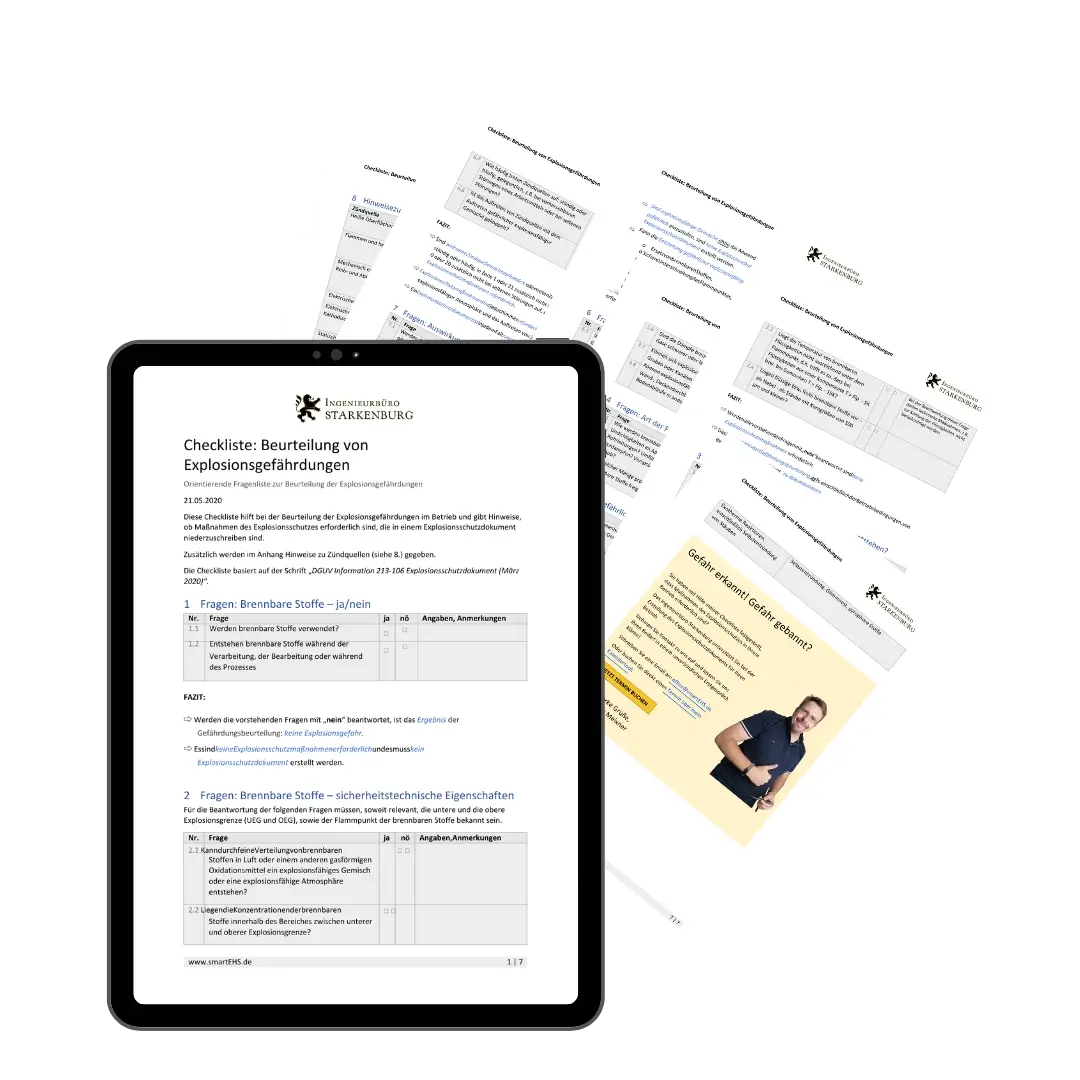 Diese Checkliste hilft bei der Beurteilung der Explosionsgefährdungen im Betrieb und gibt Ihnen Hinweise, ob Maßnahmen des Explosionsschutzes erforderlich sind, die in einem Explosionsschutzdokument niederzuschreiben sind.